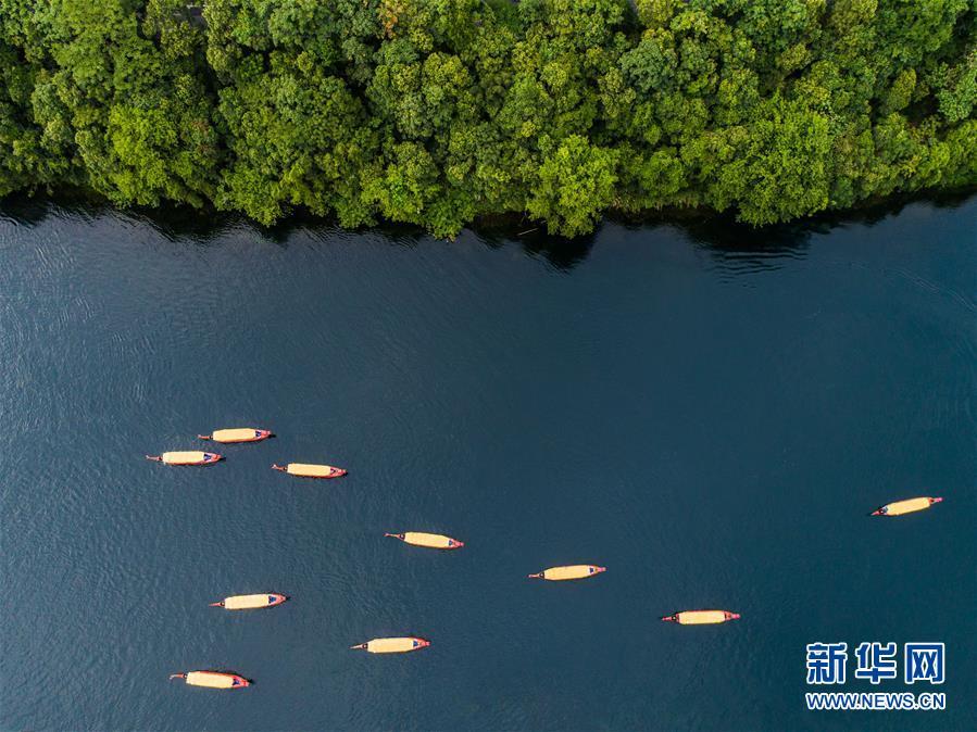 2018年7月23日,游客乘船在新安江浙江建德段江面上游玩。 大地之色,俯仰之間;壯美山河,是我的祖國。2018年,新華社記者操縱無人機(jī)“飛閱”華夏大地,在最美的時(shí)節(jié),定格下她的色彩斑斕。 新華社記者 徐昱 攝