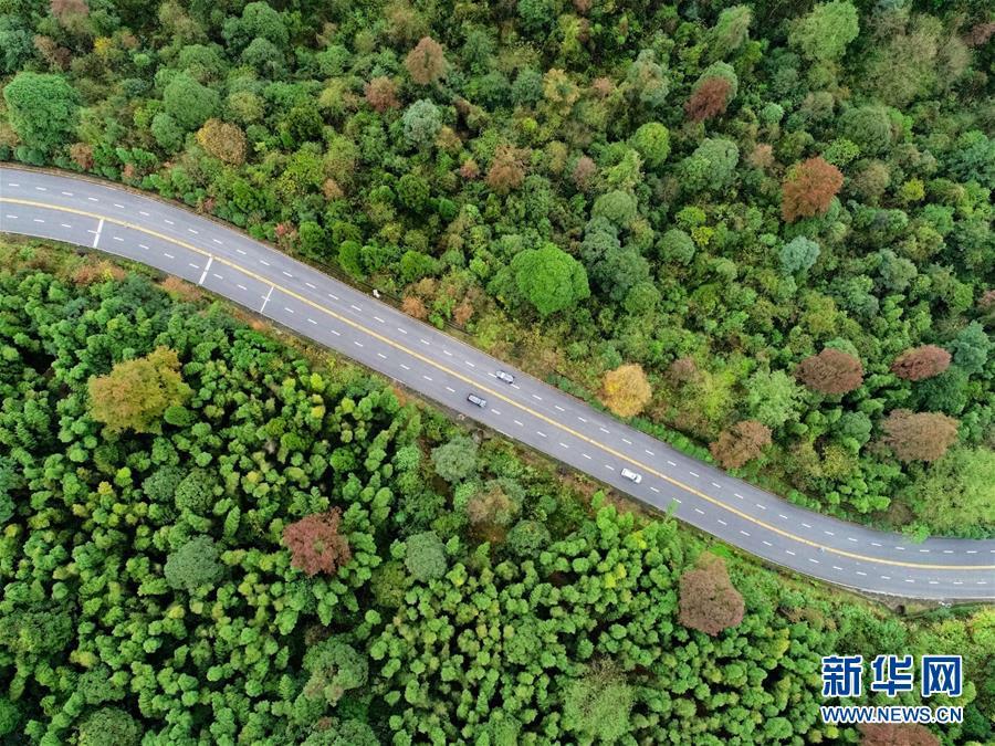 2018年11月21日,車輛行駛在國家第一條四車道盤山公路泰井高速上。 大地之色,俯仰之間;壯美山河,是我的祖國。2018年,新華社記者操縱無人機(jī)“飛閱”華夏大地,在最美的時(shí)節(jié),定格下她的色彩斑斕。 新華社記者 胡晨歡 攝