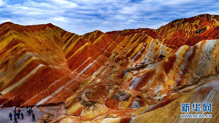 2018年9月5日,游人在張掖丹霞國家地質(zhì)公園游覽。 大地之色,俯仰之間;壯美山河,是我的祖國。2018年,新華社記者操縱無人機(jī)“飛閱”華夏大地,在最美的時(shí)節(jié),定格下她的色彩斑斕。 新華社記者 陶明 攝