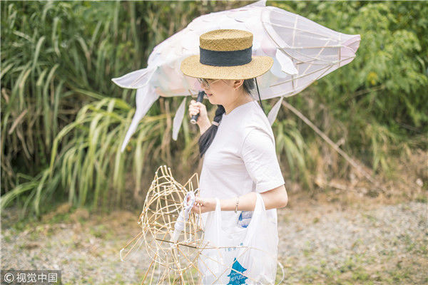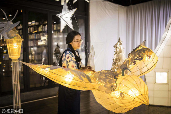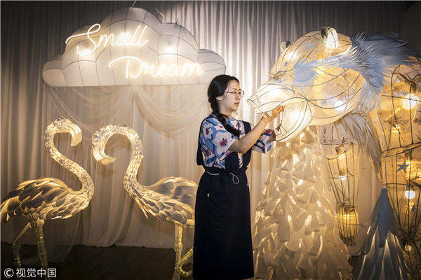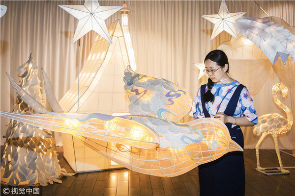 2018年5月6日,廣州,在天河區(qū)一家大商場辦個展時,用紙片做成的北極熊、大松樹、火烈鳥、紙房子在光線的配合下美輪美奐,吸引了很多顧客駐足?!皫缀趺總€人一看到,都會走進那個夢幻的場景里,和這些紙雕一起合影?!眻D片攝于2018年5月6日。南塘/視覺中國