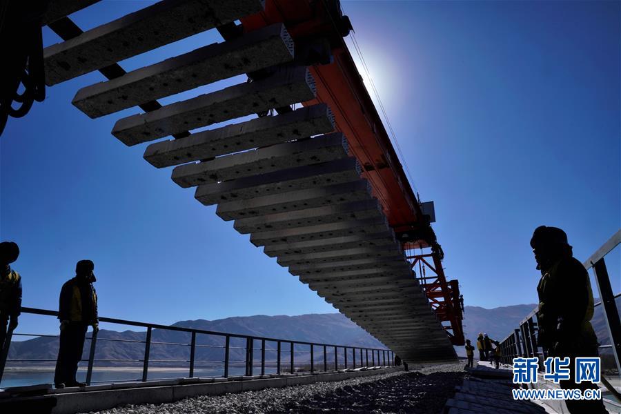 中鐵十一局的工人在川藏鐵路拉林段昌果特大橋進(jìn)行鋪軌作業(yè)(10月16日攝)。 近日,川藏鐵路拉薩至林芝段昌果特大橋開(kāi)始鋪設(shè)行軌排、架設(shè)梁片,標(biāo)志著川藏鐵路拉林段正式進(jìn)入鋪軌階段。 新華社記者 普布扎西 攝