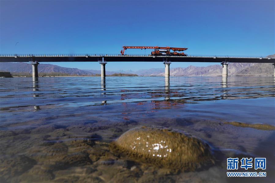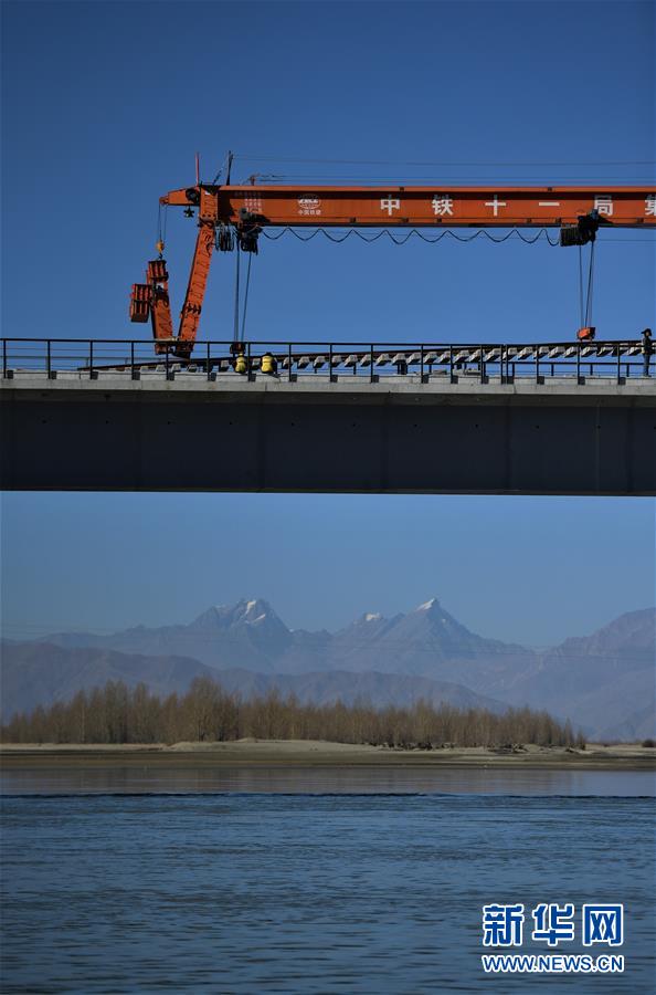 11月26日,施工人員在川藏鐵路拉林段貢嘎雅魯藏布江特大橋上鋪軌。  新華社記者 普布扎西 攝