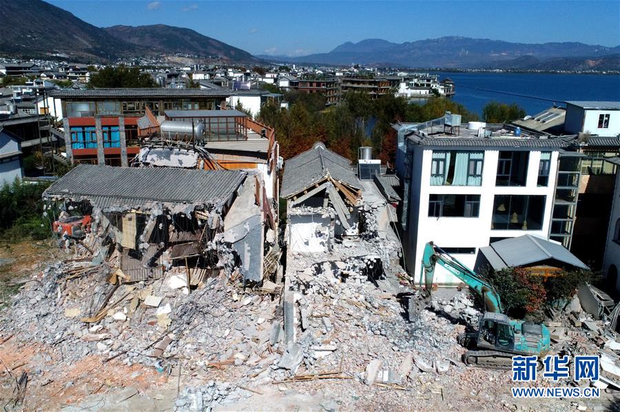 為實(shí)施“三線”劃定,喜洲鎮(zhèn)兩家民宿被拆除(11月15日無人機(jī)拍攝)。