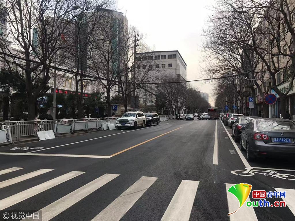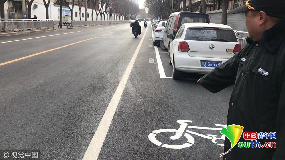 現(xiàn)場,文化宮路與友愛路口附近,新鋪好的路面被劃上了嶄新的行車線和停車位標線。從文化宮路和友愛路交叉口向北,道路東側(cè)的非機動車道被停車位占去后,僅剩下0.8米左右的寬度。同樣在路口南側(cè),道路西側(cè)的非機動車道也被新劃的停車位占去,僅剩不足1米的寬度。