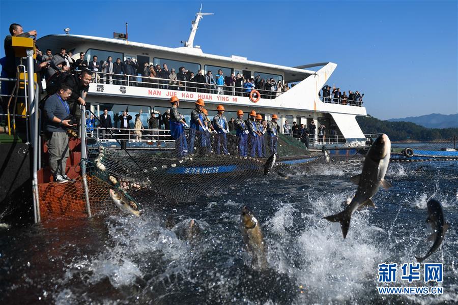 11月28日,捕撈隊員在千島湖進(jìn)行巨網(wǎng)捕魚,群魚躍出水面。