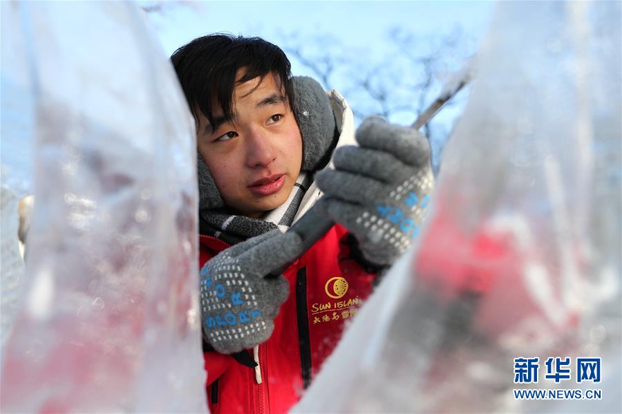 12月27日,選手在比賽中完善冰雕作品。 當日,第十六屆黑龍江省大學生冰雕藝術設計創(chuàng)作大賽在哈爾濱兆麟公園落下帷幕,全省高校共有99支隊伍參賽。 新華社記者曹霽陽攝