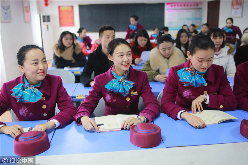 2018年12月27日,四川成都,為備戰(zhàn)即將開通的成雅鐵路,中國鐵路成都局集團有限公司成都客運段動車二隊對成雅動車的乘務人員進行理論、形體、服務禮儀等內(nèi)容的培訓。