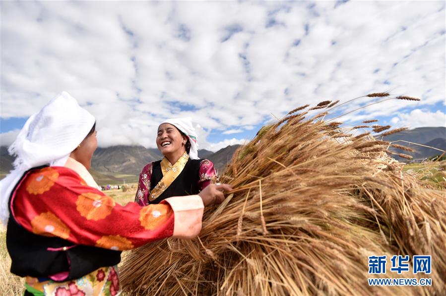 9月23日,首個(gè)中國(guó)農(nóng)民豐收節(jié),拉薩市林周縣松盤(pán)鄉(xiāng)松盤(pán)村兩名藏族農(nóng)民在田間聊天。 新華社記者 覺(jué)果 攝
