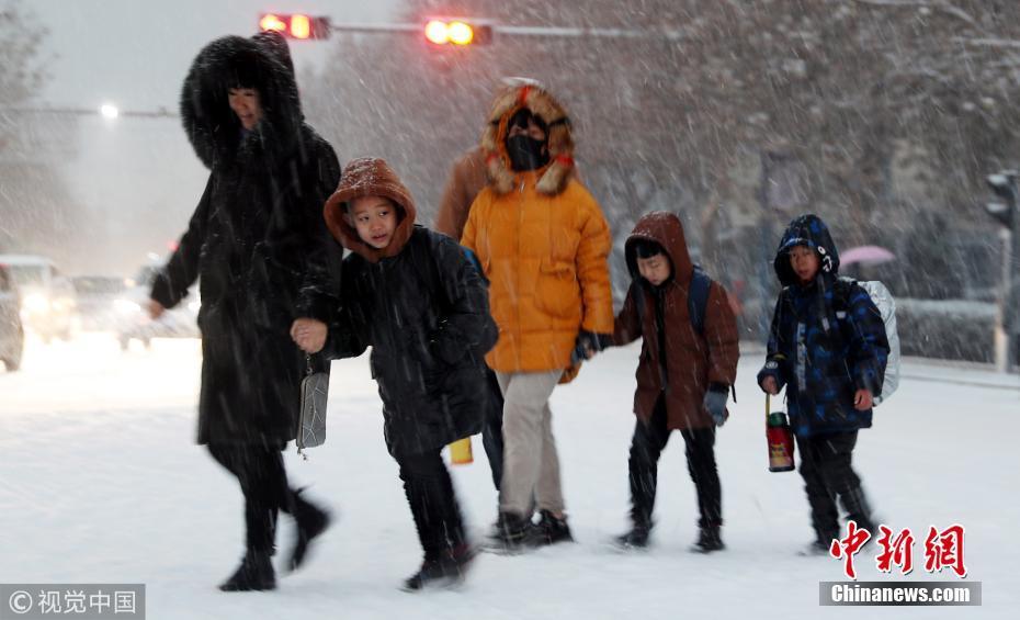 河北石家莊井陘縣縣城,人們?cè)谘┲谐鲂?。受多股冷空氣的持續(xù)影響石家莊出現(xiàn)降雪、降溫天氣。圖片來源:視覺中國