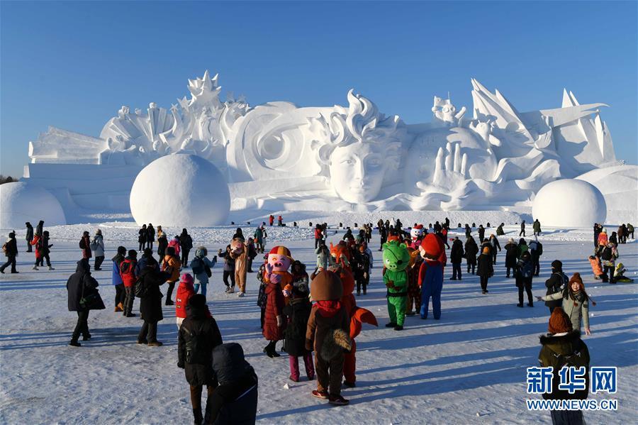 12月29日,游客在太陽島雪博會園區(qū)游玩拍照。 當(dāng)日,第31屆哈爾濱太陽島國際雪雕藝術(shù)博覽會正式開園。本屆太陽島雪博會以“歡樂雪博會·夢幻雪域游”為主題,占地90萬平方米,分為五大景區(qū)。 新華社記者 王建威 攝