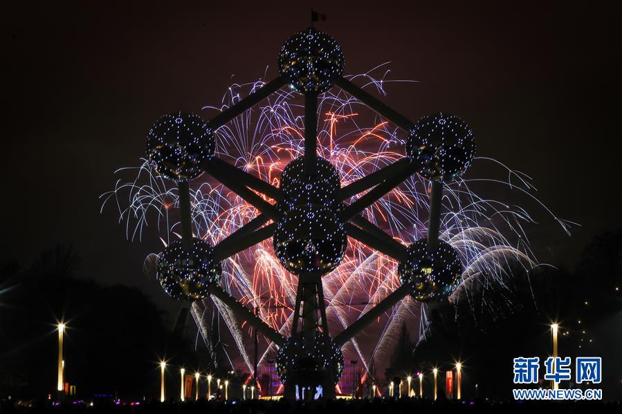 1月1日,比利時首都布魯塞爾的地標(biāo)性建筑——原子球塔附近煙花綻放。 新華社記者鄭煥松攝