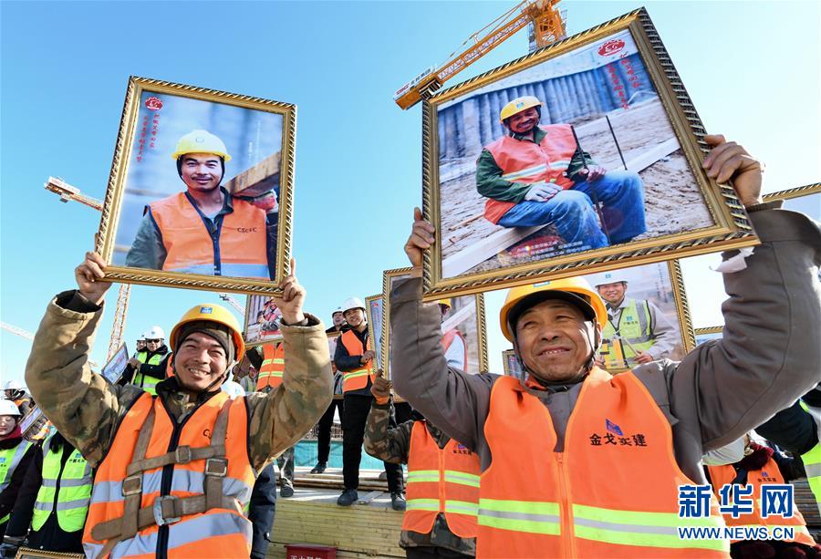 1月9日,中建一局北京城市副中心周轉(zhuǎn)房項目工地的建筑工人在展示自己的照片。 當(dāng)日,由北京市總工會主辦的工會“兩節(jié)”送溫暖活動之一的“把微笑帶回家,為最美勞動者點贊”大型公益活動,在中建一局北京城市副中心職工周轉(zhuǎn)房項目工地舉行。眾多勞動者獲贈“微笑”肖像照和保溫壺、毛巾等新春“大福包”。 新華社記者 李欣 攝