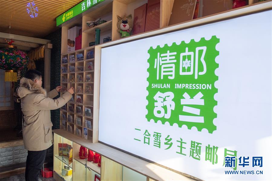 1月10日,在舒蘭市二合屯主題郵局,游客在挑選明信片。 新華社記者張楠攝