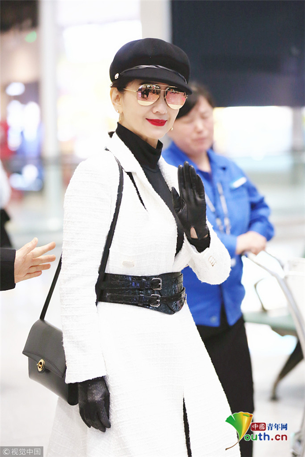 1月10日,廣東省深圳市,趙雅芝夫婦現(xiàn)身深圳寶安機場,頭戴貝雷帽的她架著反光墨鏡,一襲白色不規(guī)則連衣裙配上黑色腰封及皮靴,酷似甜美女教官!