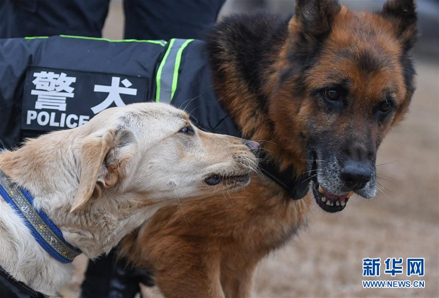 1月15日,即將組成搭檔的警犬“皮特”(前)與“哼哼”在一起。 新華社記者 程敏 攝