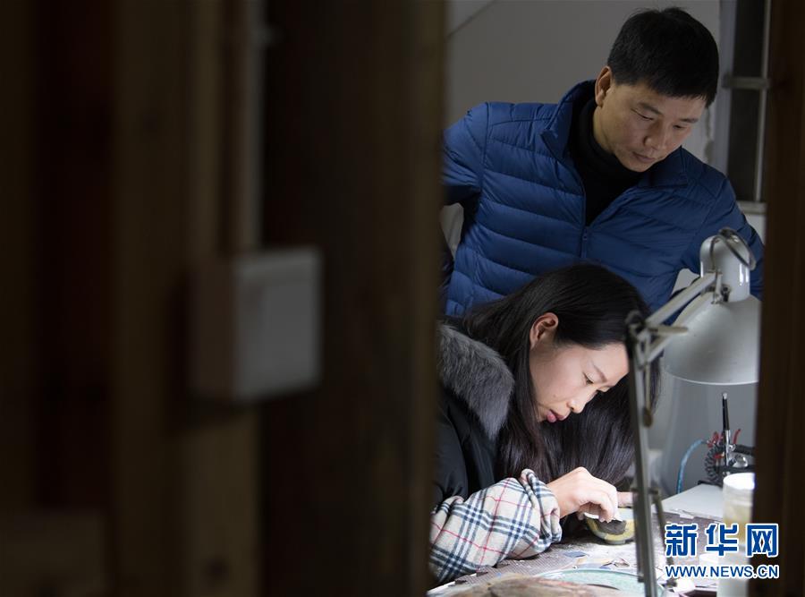 1月15日,吳榮強(qiáng)和妻子李淑敏在龍泉市牛頭嶺村“七分醉”工作室對(duì)一件漆繕器皿進(jìn)行打磨。吳榮強(qiáng)將工作室搬回龍泉后,原本從事設(shè)計(jì)行業(yè)的妻子也辭職加入工作室的日常工作。 新華社記者翁忻旸攝