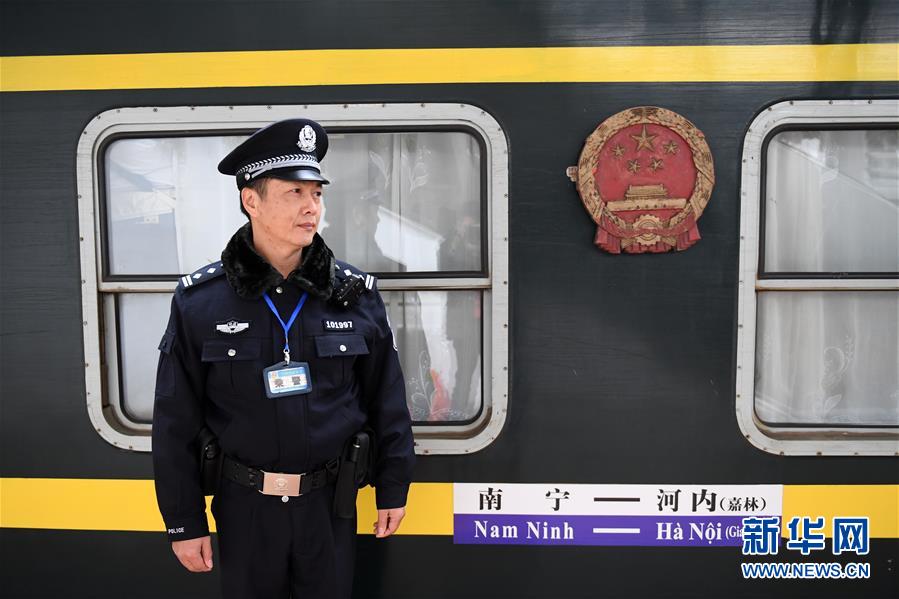 1月1日,在廣西南寧火車站,楊鐵鳴在剛剛從越南河內(嘉林)開來的列車旁值勤。楊鐵鳴是第一趟中越國際客運列車的當班乘警,現在依然在這趟列車上值守。 新華社記者陸波岸攝