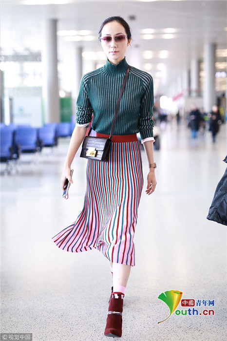 2019年1月17日,上海,韓雪現(xiàn)身機場,穿著條紋紗裙露出小腿,十分抗凍,她搭配經(jīng)典的駝色大衣,氣質(zhì)出眾在機場人群中相當搶鏡。