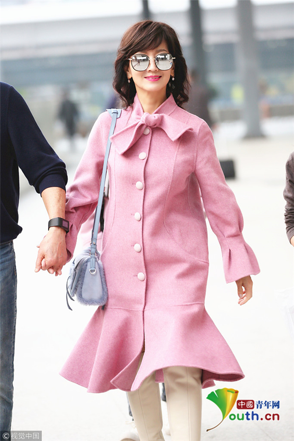 趙雅芝著粉嫩魚(yú)尾大衣優(yōu)雅甜美 獲老公一路牽手