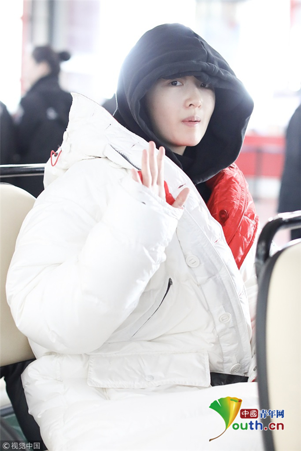 1月23日,北京,周冬雨現(xiàn)身機(jī)場(chǎng)。她用黑色連衣帽罩頭襯托巴掌臉,把下巴擱在行李車推桿上的雙手上呆萌可愛 。