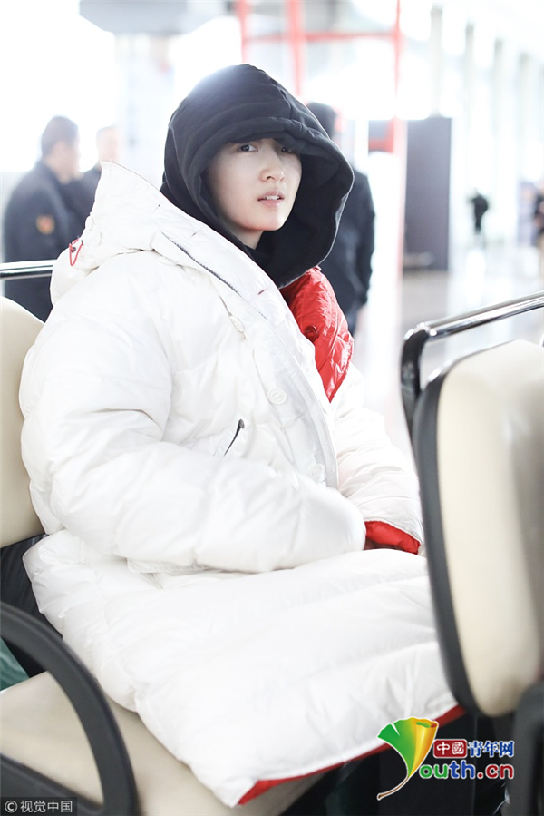 1月23日,北京,周冬雨現(xiàn)身機(jī)場(chǎng)。她用黑色連衣帽罩頭襯托巴掌臉,把下巴擱在行李車推桿上的雙手上呆萌可愛(ài) 。