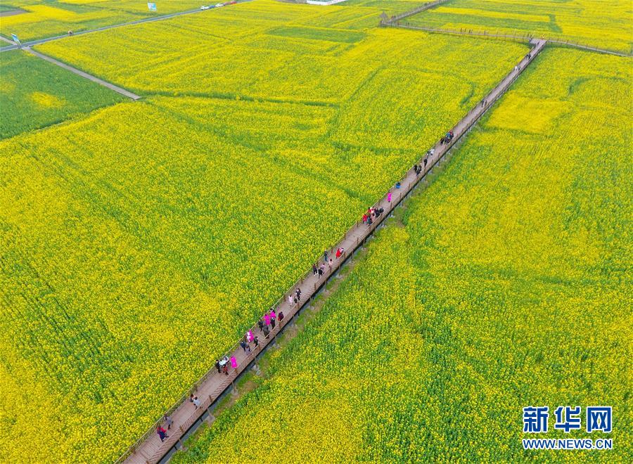 初春時(shí)節(jié),四川廣漢市西高鎮(zhèn)的油菜花盛開。金黃的油菜花與民居、道路等形成一幅幅鄉(xiāng)村畫卷,吸引游人踏青賞景。