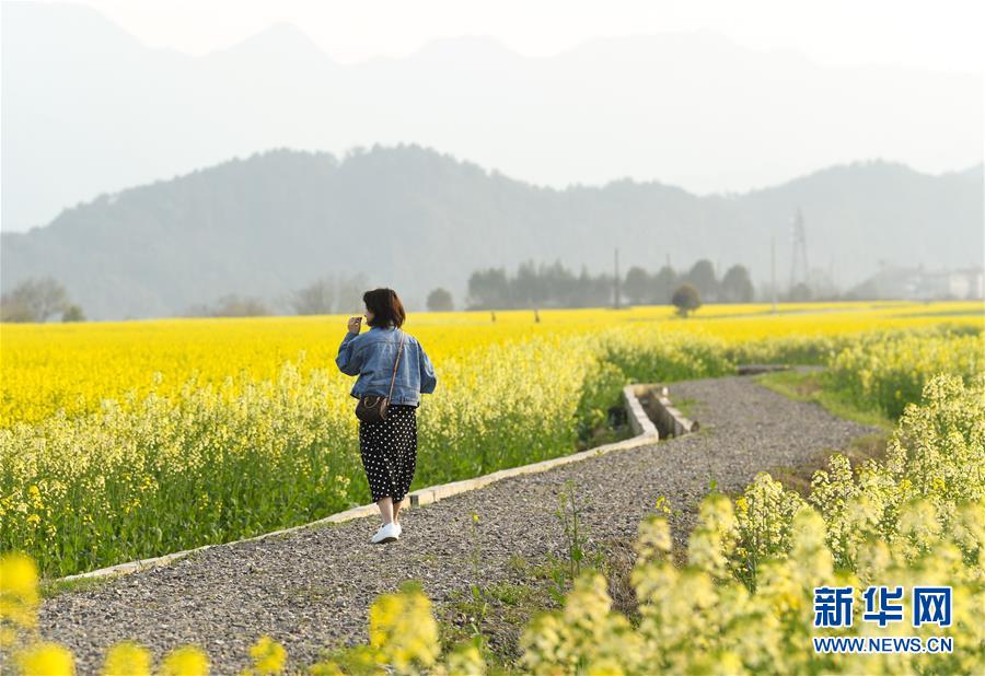 3月19日,游人在下涯鎮(zhèn)油菜花海中游玩。近日,浙江省建德市下涯鎮(zhèn)油菜花盛開,吸引不少游客前來踏春。 新華社記者翁忻旸攝