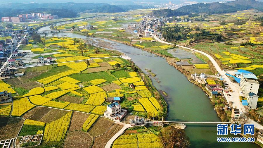 3月20日在貴州錦屏縣敦寨鎮(zhèn)拍攝的春景(無人機(jī)拍攝)。春分將至,貴州各地成片的油菜花漸次綻放,如同金色的地毯鋪上云貴高原。 新華社記者 歐東衢 攝