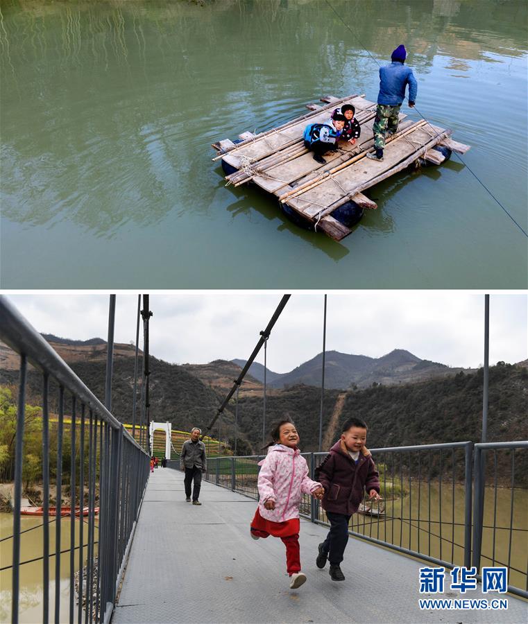 這是一張拼版照片:上圖為略陽縣徐家坪鎮(zhèn)藥木院村江口壩組的余皓軒(左)、劉紫涵(中),由余皓軒的外公劉德安撐上簡易木筏,去對岸的幼兒園上學(xué)(2018年11月22日無人機拍攝);下圖為余皓軒(前右)、劉紫涵(前左)放學(xué)歸來,手拉手走在新修的鋼結(jié)構(gòu)吊橋上(2019年3月25日攝)。