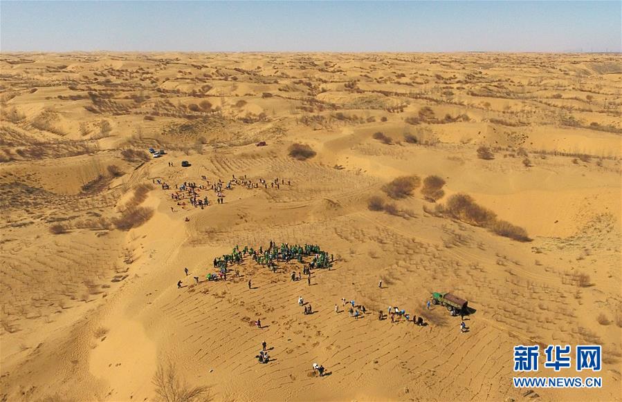 3月31日,中韓青年在內(nèi)蒙古達拉特旗庫布其沙漠中植樹(無人機拍攝)。 當日,200余名中韓兩國青年志愿者來到內(nèi)蒙古自治區(qū)達拉特旗庫布其沙漠種樹。2006年起,中國國際青年交流中心與韓國韓中文化青少年協(xié)會組織兩國青年志愿者在庫布其沙漠植樹,參與防沙固沙項目。截至目前已植樹850多萬株,造林3萬多畝。 新華社記者 劉磊 攝