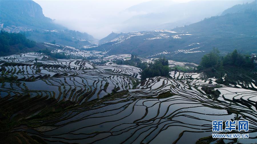 這是在云南省元陽(yáng)縣拍攝的傍晚時(shí)分的哈尼梯田美景(4月3日無(wú)人機(jī)拍攝)。哈尼梯田位于云南省哀牢山南部,以哈尼族為主的當(dāng)?shù)厝罕娗О倌陙?lái)生生不息在大地上“雕刻”出這一農(nóng)耕文明奇觀。春日里,漫山的水稻梯田與云海、森林、村莊形成一幅美麗的畫(huà)卷,吸引眾多海內(nèi)外游客前來(lái)觀賞。新華社記者 胡超 攝