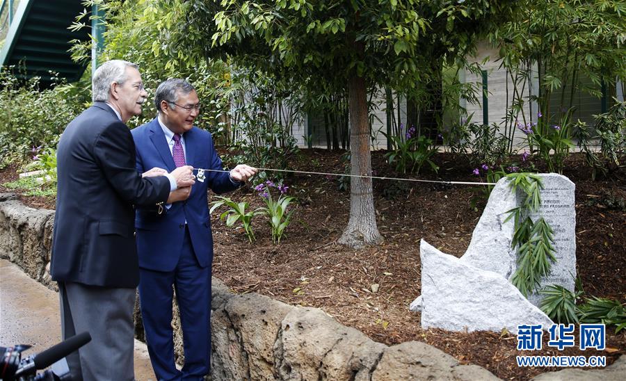 4月6日,在美國(guó)圣迭戈動(dòng)物園,中國(guó)駐洛杉磯總領(lǐng)事張平(右)為“大熊貓保護(hù)項(xiàng)目”紀(jì)念碑揭幕。新華社記者李穎攝