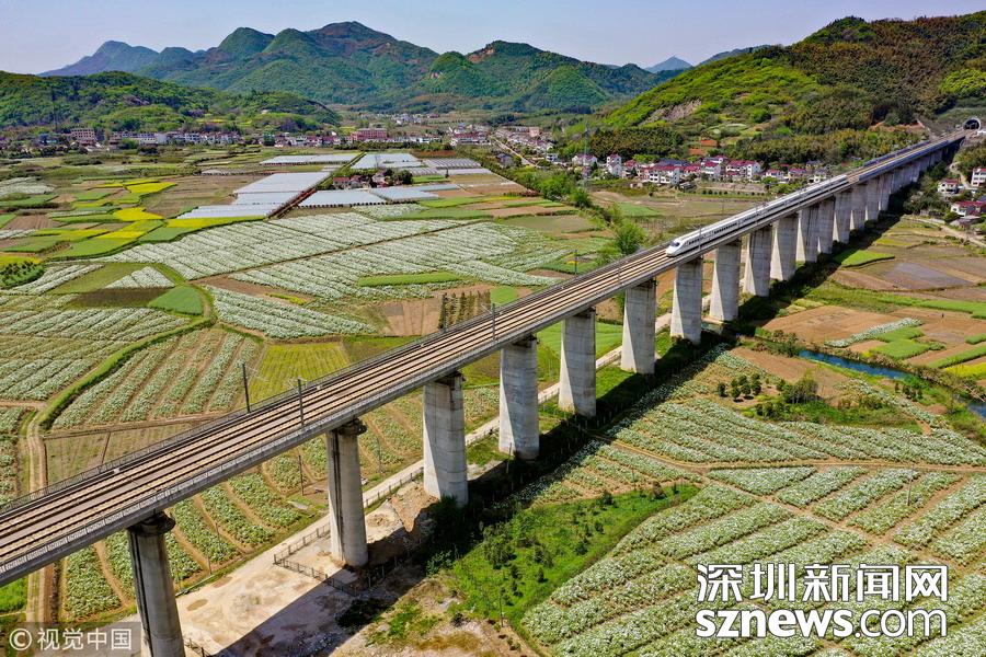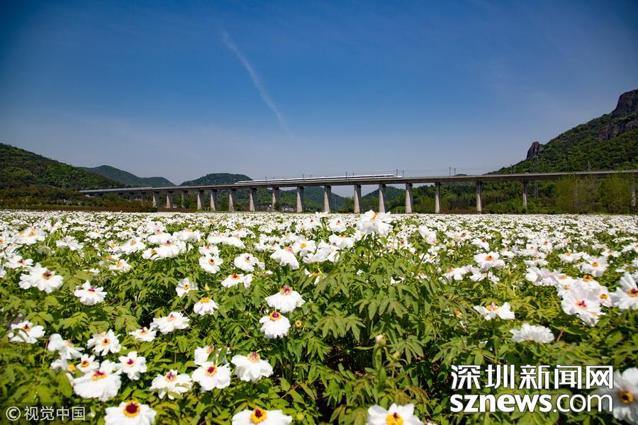 2019年4月8日,一列高鐵列車從京福高鐵安徽銅陵段一片盛開(kāi)的鳳丹花海中駛過(guò)。隨著氣溫回升,安徽省銅陵市境內(nèi)的鳳丹競(jìng)相綻放,高鐵列車穿行其間,成為春日里一道美麗的風(fēng)景線。