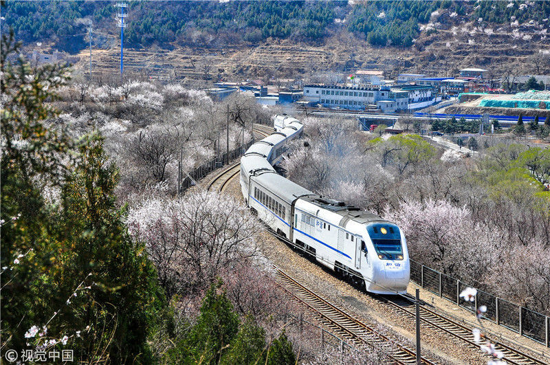 2019年3月22日,北京居庸關(guān)附近的山花盛開(kāi),S2線列車穿行在花海之中,構(gòu)成一幅美麗的畫面。時(shí)永平/千龍圖像/視覺(jué)中國(guó) 編輯/陳進(jìn)