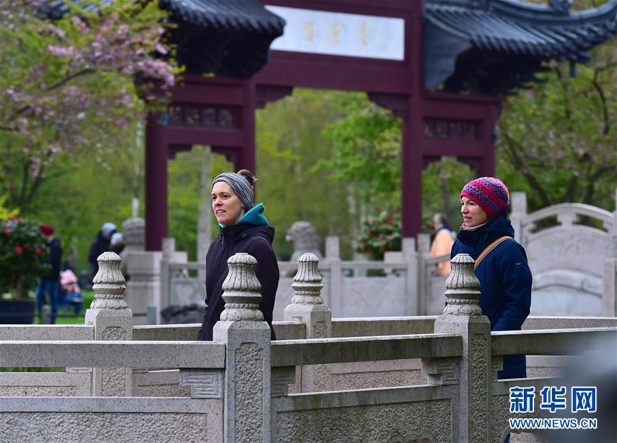 2019年4月13日,在德國曼海姆,游客在中式園林“多景園”內(nèi)游玩。“多景園”位于曼海姆市路易森公園內(nèi),占地約6000平方米,建筑面積約1500平方米,是目前歐洲最為完整的中國古典園林建筑群落之一。 新華社記者逯陽攝
