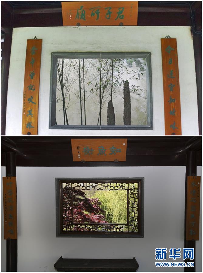 這張拼版照片展示的是:上圖,2019年4月2日拍攝的中國蘇州留園一景(新華社記者杜涓涓攝);下圖,2017年4月28日拍攝的美國紐約寄興園一景(新華社記者王迎攝)。