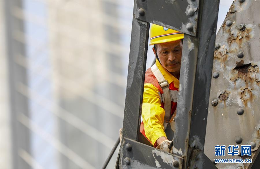 中國鐵路成都局有限公司重慶工務段53歲的橋隧工唐金華在白沙沱長江大橋的鋼架上檢查鋼梁的銹蝕情況(4月23日攝)。 4月23日下午5點40分,隨著重慶白沙沱長江大橋通行的最后一列客運列車順利通過,這座“服役”了59年的重慶首座長江大橋進入“退役”倒計時。4月24日后,所有列車將改線經距白沙沱長江大橋約100米的新白沙沱長江特大橋通行,新橋“接力”老橋,運輸能力將得到大幅提升。 白沙沱長江大橋于1958年開工,1960年通過首趟列車,是繼武漢長江大橋之后的第二座長江大橋。 新華社記者 劉潺 攝