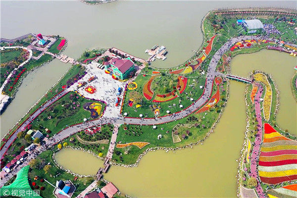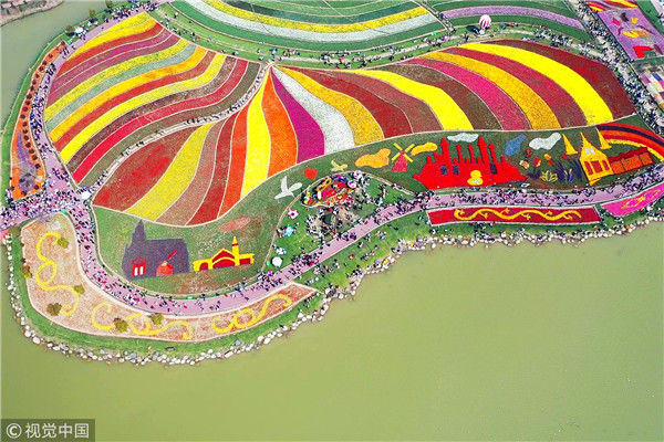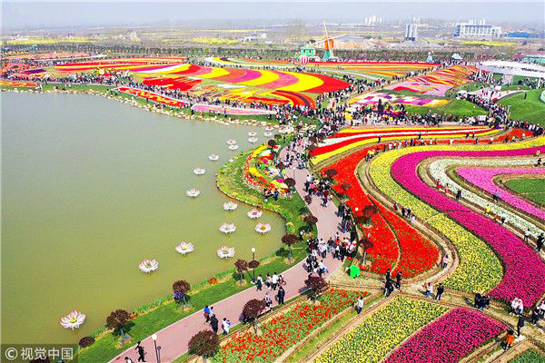 2019年4月6日,江蘇鹽城,大豐荷蘭花海景區(qū),人們?cè)谫p花游玩,盡享春光。