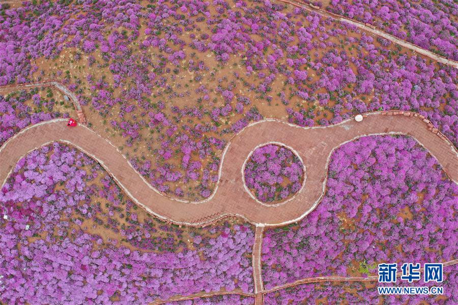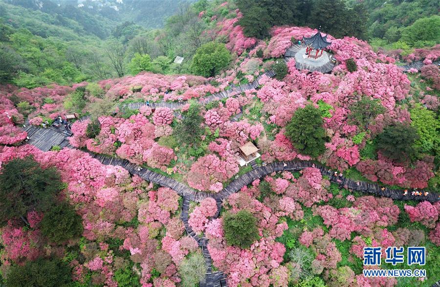 4月25日,游客在龜峰山杜鵑花海中游玩(無(wú)人機(jī)拍攝)。 近日,湖北省麻城市龜峰山的10萬(wàn)畝古杜鵑盛開(kāi),大量游客前來(lái)賞花觀景。 新華社記者 程敏 攝
