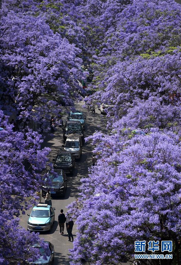 昆明市教場(chǎng)中路一帶的藍(lán)花楹進(jìn)入盛花期(4月24日攝)。近日,云南昆明市不少街區(qū)的藍(lán)花楹相繼開(kāi)放,為美麗春城增添了一處處風(fēng)景。 新華社記者秦晴攝