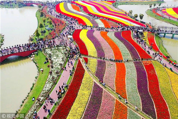 2019年4月6日,江蘇鹽城市大豐荷蘭花海的300萬(wàn)株郁金香隨風(fēng)盛開(kāi),吸引了眾多市民和游客前來(lái)觀賞。從空中看,一片片彩色的郁金香花田仿佛巨幅彩帶,將數(shù)百畝花海裝扮得分外美麗。楊素平/視覺(jué)中國(guó)