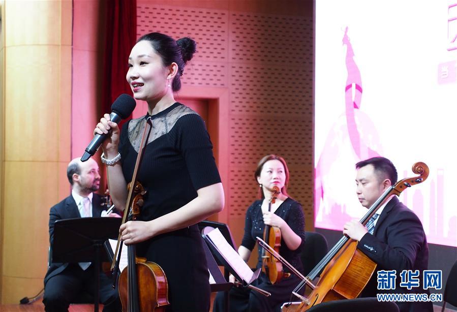 4月25日,上海交響樂團(tuán)的中提琴手巴桐在演奏前介紹曲目。 當(dāng)日,第一場(chǎng)“全城交響·上交為你而來(lái)”音樂會(huì)在復(fù)旦大學(xué)附屬腫瘤醫(yī)院報(bào)告廳奏響,為患者及醫(yī)護(hù)人員獻(xiàn)上一場(chǎng)專屬音樂會(huì)?!叭墙豁憽ど辖粸槟愣鴣?lái)”是上海交響樂團(tuán)2019年向全上海的機(jī)構(gòu)及個(gè)人開放的公益演出項(xiàng)目。 新華社記者 任瓏 攝