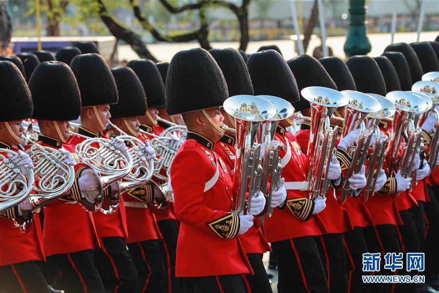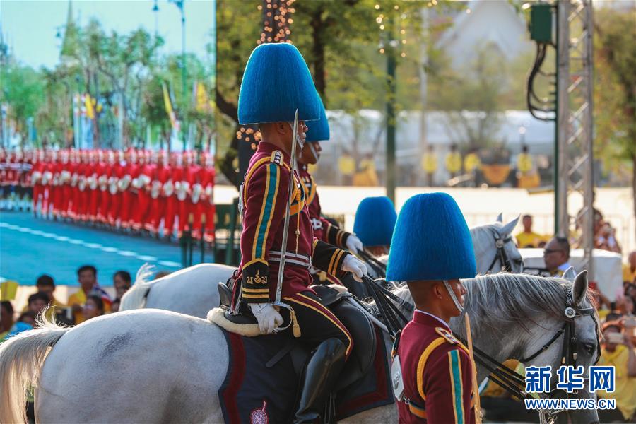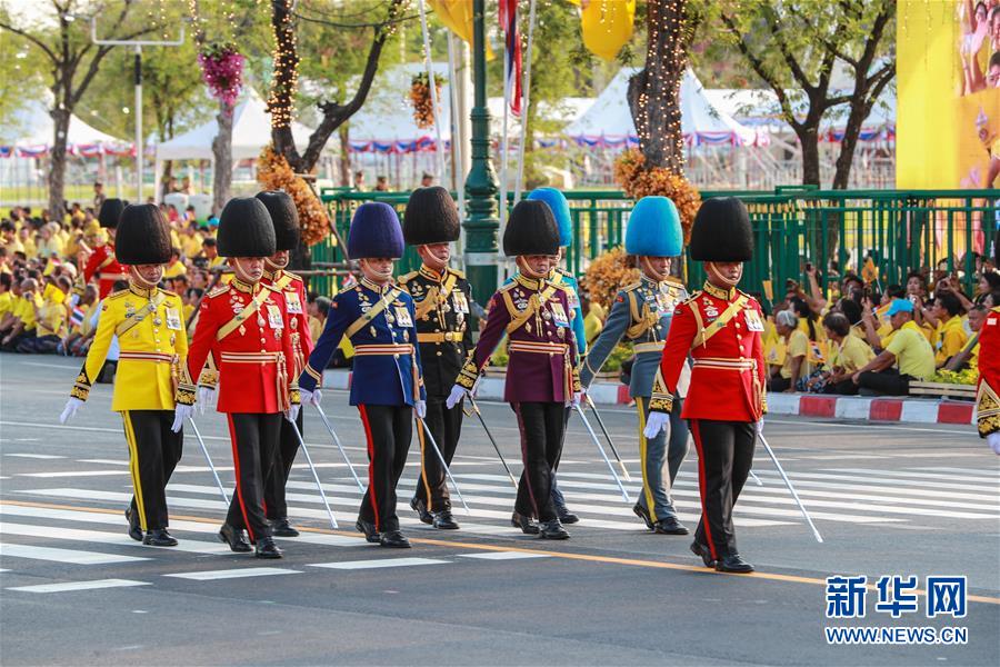 5月5日,儀仗隊(duì)在曼谷大王宮附近舉行的泰國國王加冕典禮巡游上列隊(duì)前進(jìn)。 新華社發(fā)(拉亨攝)
