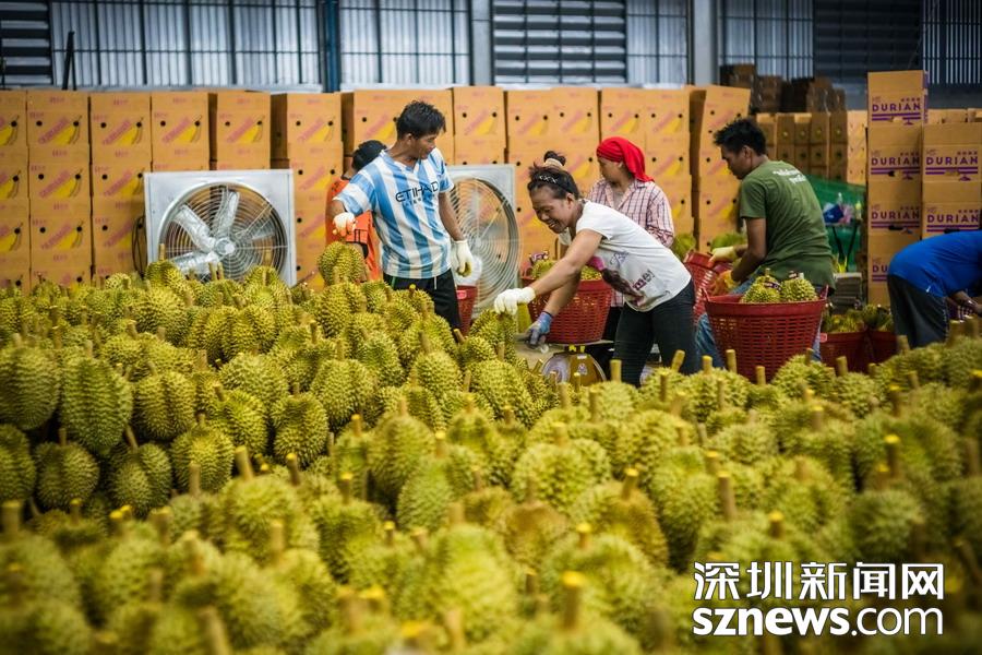 2018年4月20日晚上11點(diǎn),泰國(guó)尖竹汶府的金枕頭榴蓮分裝廠區(qū)內(nèi)燈火通明,工人們正在對(duì)剛摘下來(lái)的20多噸榴蓮打包、稱重。