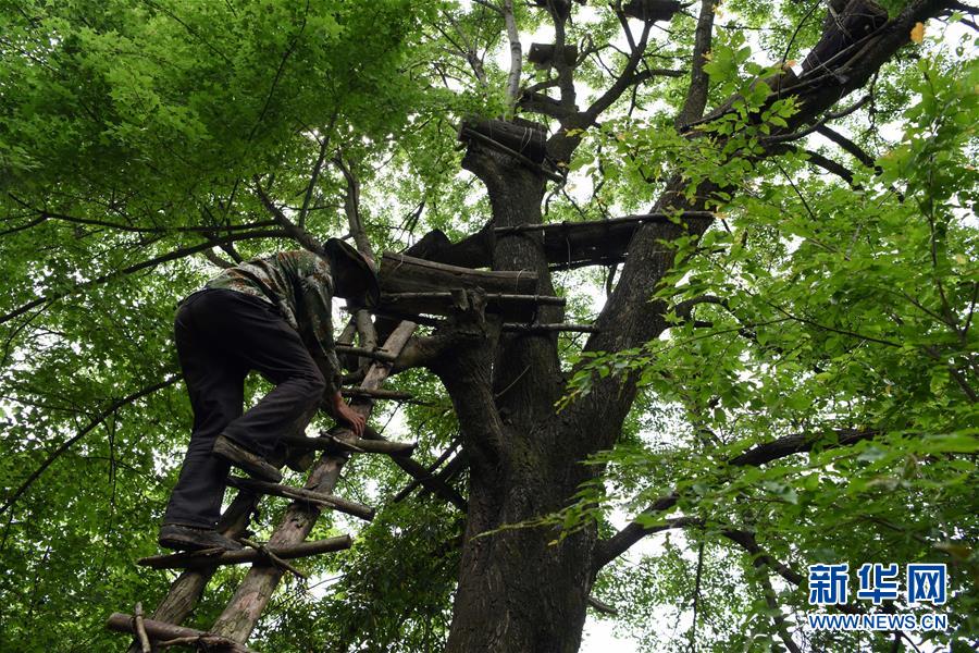 5月10日,在甘肅省隴南市徽縣大河店鎮(zhèn)硬灣村,蜂農(nóng)劉輝林準備查看放在樹上的蜂箱情況。 甘肅省隴南市徽縣大河店鎮(zhèn)硬灣村位于秦巴山區(qū)深處,2017年,在當?shù)卣姆龀窒?,龍崖老巢蜜養(yǎng)殖農(nóng)民專業(yè)合作社成立,蜂農(nóng)們將傳統(tǒng)養(yǎng)蜂技藝和現(xiàn)代加工方式相結(jié)合,并通過電商等渠道打開銷路,有效帶動了當?shù)刎毨Т迕衩撠氈赂?。目前整個合作社共有蜂箱2000余個,每箱每年可帶來三四千元的收入。 新華社記者 馬寧 攝