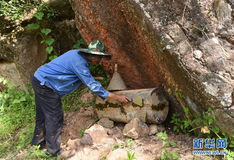 5月10日,在甘肅省隴南市徽縣大河店鎮(zhèn)硬灣村,蜂農(nóng)周仲頤(右)在收蜂。 甘肅省隴南市徽縣大河店鎮(zhèn)硬灣村位于秦巴山區(qū)深處,2017年,在當?shù)卣姆龀窒?,龍崖老巢蜜養(yǎng)殖農(nóng)民專業(yè)合作社成立,蜂農(nóng)們將傳統(tǒng)養(yǎng)蜂技藝和現(xiàn)代加工方式相結(jié)合,并通過電商等渠道打開銷路,有效帶動了當?shù)刎毨Т迕衩撠氈赂?。目前整個合作社共有蜂箱2000余個,每箱每年可帶來三四千元的收入。 新華社記者 馬寧 攝