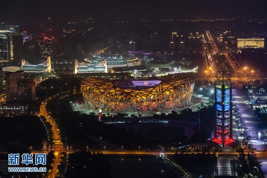 “鳥巢”和玲瓏塔交相輝映(5月14日攝)。 當(dāng)晚,一場“空間光影秀”在北京上演。 新華社記者 陳建力 攝