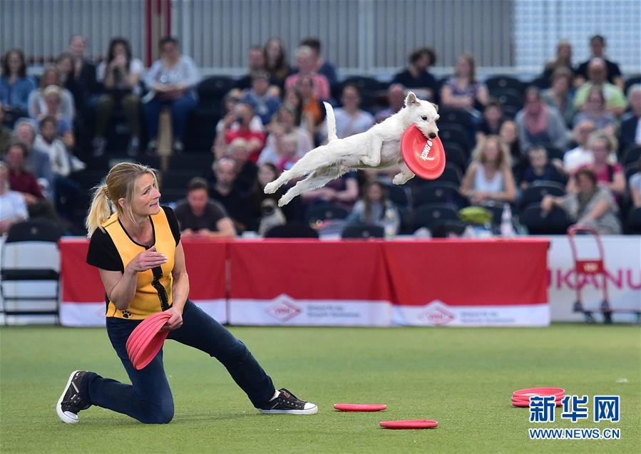5月19日,在德國多特蒙德舉行的寵物展上,訓(xùn)犬師沃爾夫帶著愛犬進行“狗接飛盤”表演。 為期三天的德國多特蒙德“狗和貓”寵物展19日落幕。寵物展期間,人們帶著自己的“萌寵”來到會場,參與寵物跳水、舞蹈、選美等趣味比賽,并與其他寵物愛好者及展商交流互動。 新華社記者逯陽攝
