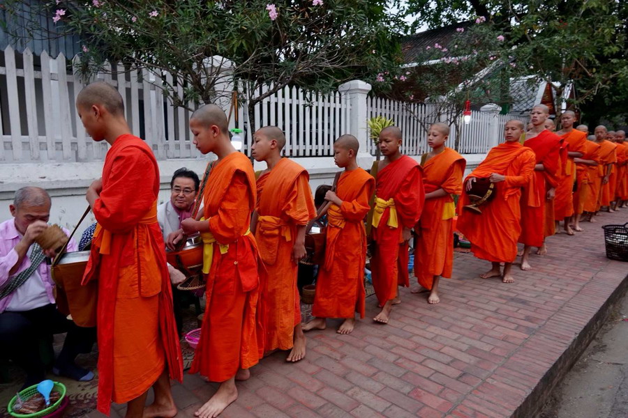 每天清晨,虔誠的佛教徒備好花塔和糯米飯,跪坐在街道兩旁,等候僧侶前來化緣,然后將糯米飯和粽子放到他們的化緣缽中,僧侶則以誦經祈福答謝施主。