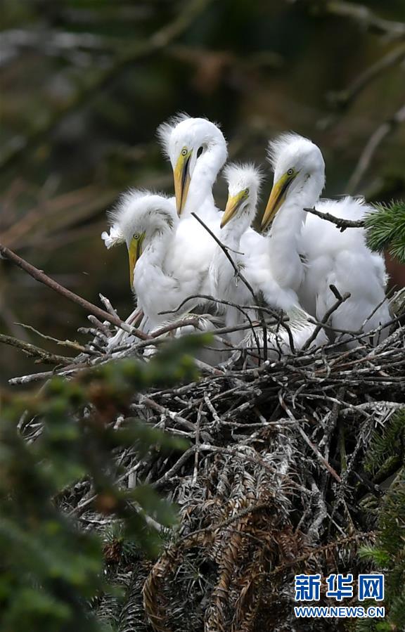 江西省南昌市新建區(qū)象山森林公園內的白鷺雛鳥(5月21日攝)。 近日,在江西省南昌市新建區(qū)象山森林公園內,已安家筑巢的大批鷺鳥陸續(xù)孵化出了后代。象山森林公園有著“鷺鳥王國”的美譽,生態(tài)環(huán)境良好,每年都會吸引白鷺、蒼鷺、夜鷺等種類的鷺鳥飛抵棲息和繁衍后代。 新華社記者 彭昭之 攝